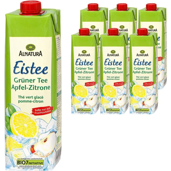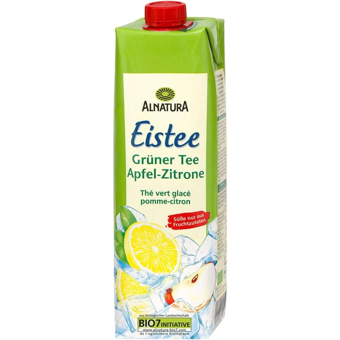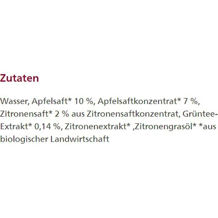 Zutaten: Wasser, Apfelsaft* 10 %, Apfelsaftkonzentrat* 7 %, Zitronensaft* 2 % aus Zitronensaftkonzentrat, Grüntee-Extrakt* 0,14 %, Zitronenextrakt* ,Zitronengrasöl*