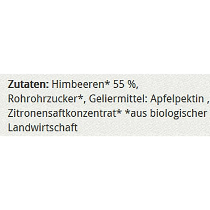 Zutaten: Himbeeren* 55 %, Rohrohrzucker*, Geliermittel: Apfelpektin , Zitronensaftkonzentrat*