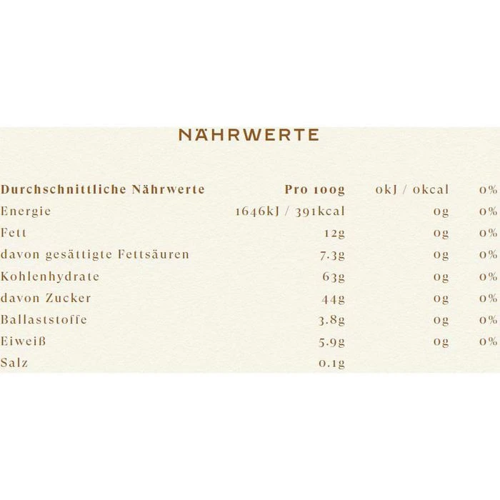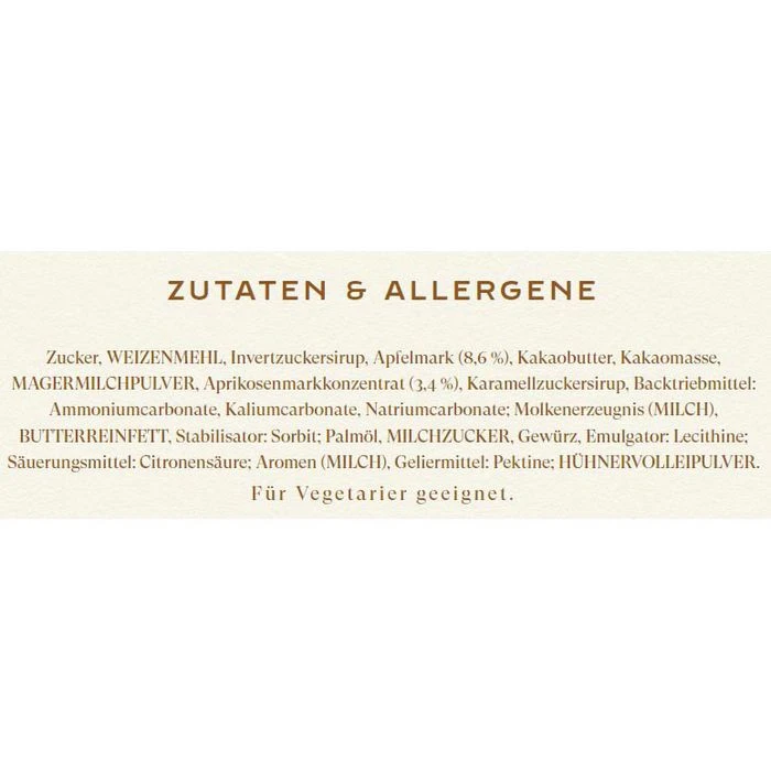 Zutaten: Zucker, WEIZENMEHL, Invertzuckersirup, Apfelmark (8,6 %), Kakaobutter, Kakaomasse, MAGERMILCHPULVER, Aprikosenmarkkonzentrat (3,4 %), Karamellzuckersirup, Backtriebmittel: Ammoniumcarbonate, Kaliumcarbonate, Natriumcarbonate; MOLKENERZEUGNIS, BUTTERREINFETT, Stabilisator: Sorbit; Palmöl, MILCHZUCKER, Gewürz, Säuerungsmittel: Citronensäure; Emulgator: Lecithine (SOJA); Aromen (MILCH); Geliermittel: Pektine; HÜHNERVOLLEIPULVER