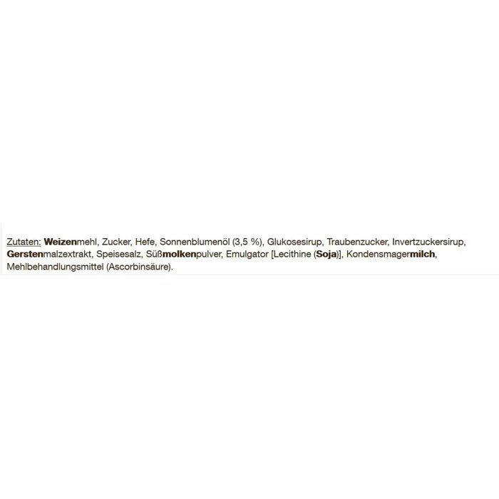 Zutaten: WEIZENMEHL, Zucker, Hefe, Sonnenblumenöl, Glukosesirup, Traubenzucker, Invertzuckersirup, GERSTENMALZEXTRAKT, Speisesalz, SÜßMOLKENPULVER, Emulgator (SOJALECITHINE), KONDENSMAGERLICH, Mehlbehandlungsmittel (Ascorbinsäure)