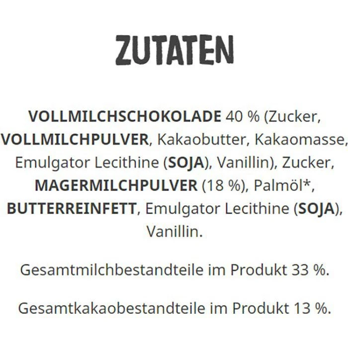 Zutaten: VOLLMILCHSCHOKOLADE 40% (Zucker, VOLLMILCHPULVER, Kakaobutter, Kakaomasse, Emulgator Lecithine (SOJA), Vanillin), Zucker, MAGERMILCHPULVER (18%), Palmöl*, BUTTERREINFETT, Emulgator Lecithine (SOJA), Vanillin.
