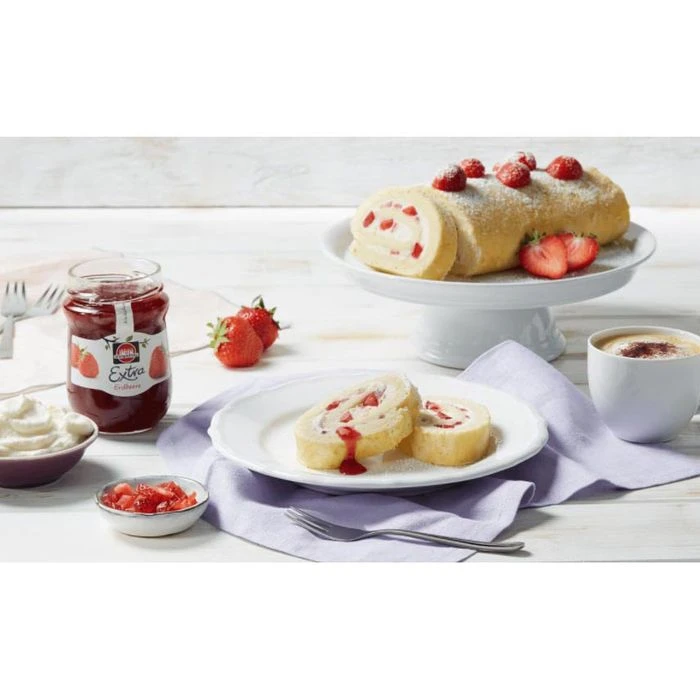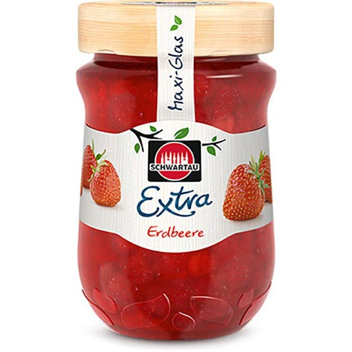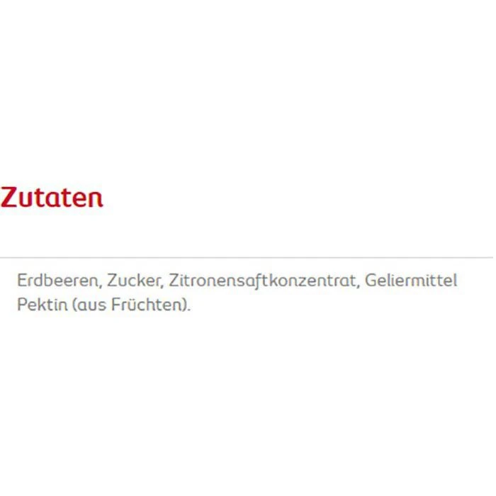 Zutaten: Erdbeeren, Zucker, Zitronensaftkonzentrat, Geliermittel Pektin (aus Früchten).