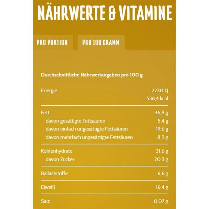 Zutaten: 70% Nuss-/Kernmischung (ERDNUSSKERNE geröstet, Cashew-Kerne geröstet, MANDELN geröstet), 30% Rosinen, pflanzliches Öl (Palm, Sonnenblume)